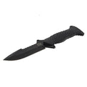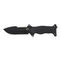 Young design hard use fixed blade. Full tang fixed blade. Matte charcoal titanium nitride blade finish. TPR over molded handle material. Other Feature: Integral glass breaker in handle butt.