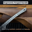Hand-Forged Marking Knife Kiridashi with rounded blade, a top-rated tool renowned for its exceptional performance and reliability. This well-balanced knife, features a hand-forged, 52100 carbon steel blade adhering to ASTM A295 standards. With a hardness of 59/62 HRC, this blade holds its edge exceptionally well, effortlessly slicing through various thicknesses of leather for enhanced productivity and leatherworking precision.
